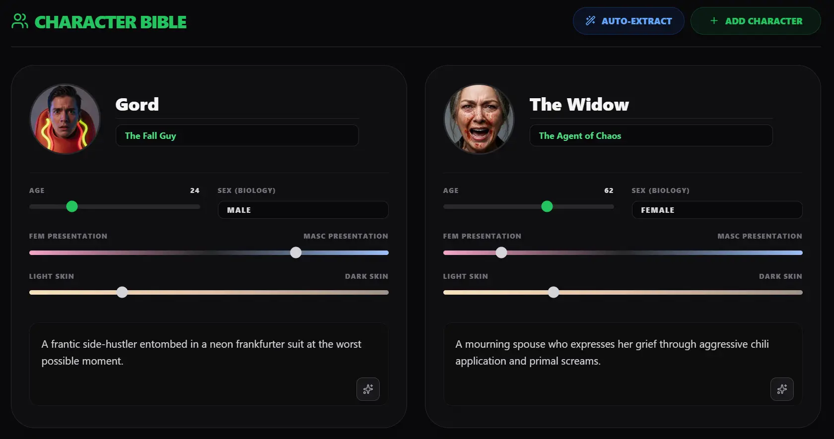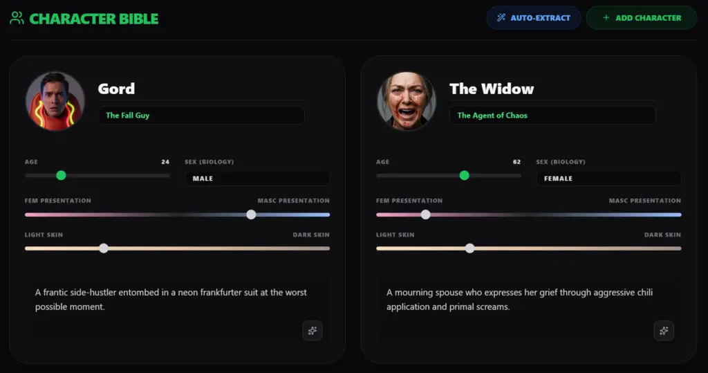The Sliders: Build your cast visually. Use sliders to dial in their age, femme/masc presentation, and melanin levels.