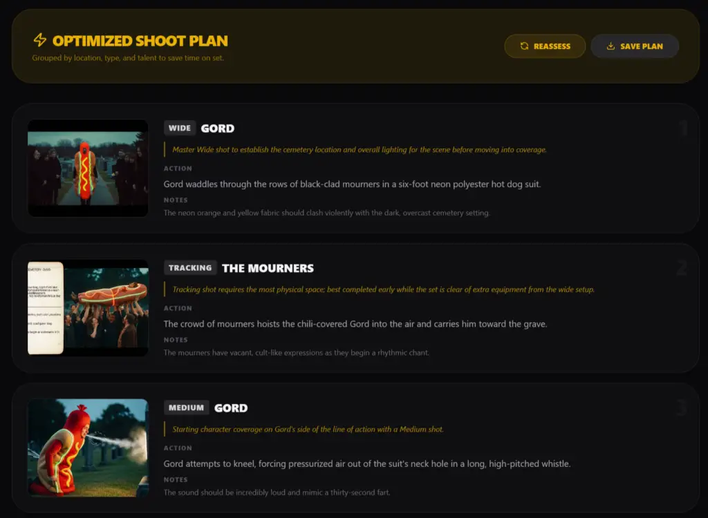 The Shoot Plan: “Fix It In Post” usually happens because you ran out of time on set. Let the AI act as your 1st AD. It analyzes your storyboard and reorganizes the chronological mess into a highly optimized shooting order—grouping by location caveats, cast, and camera setups. Print the clean text list to a PDF, hand it to your crew, and stop moving the same lights back and forth twelve times in one afternoon.