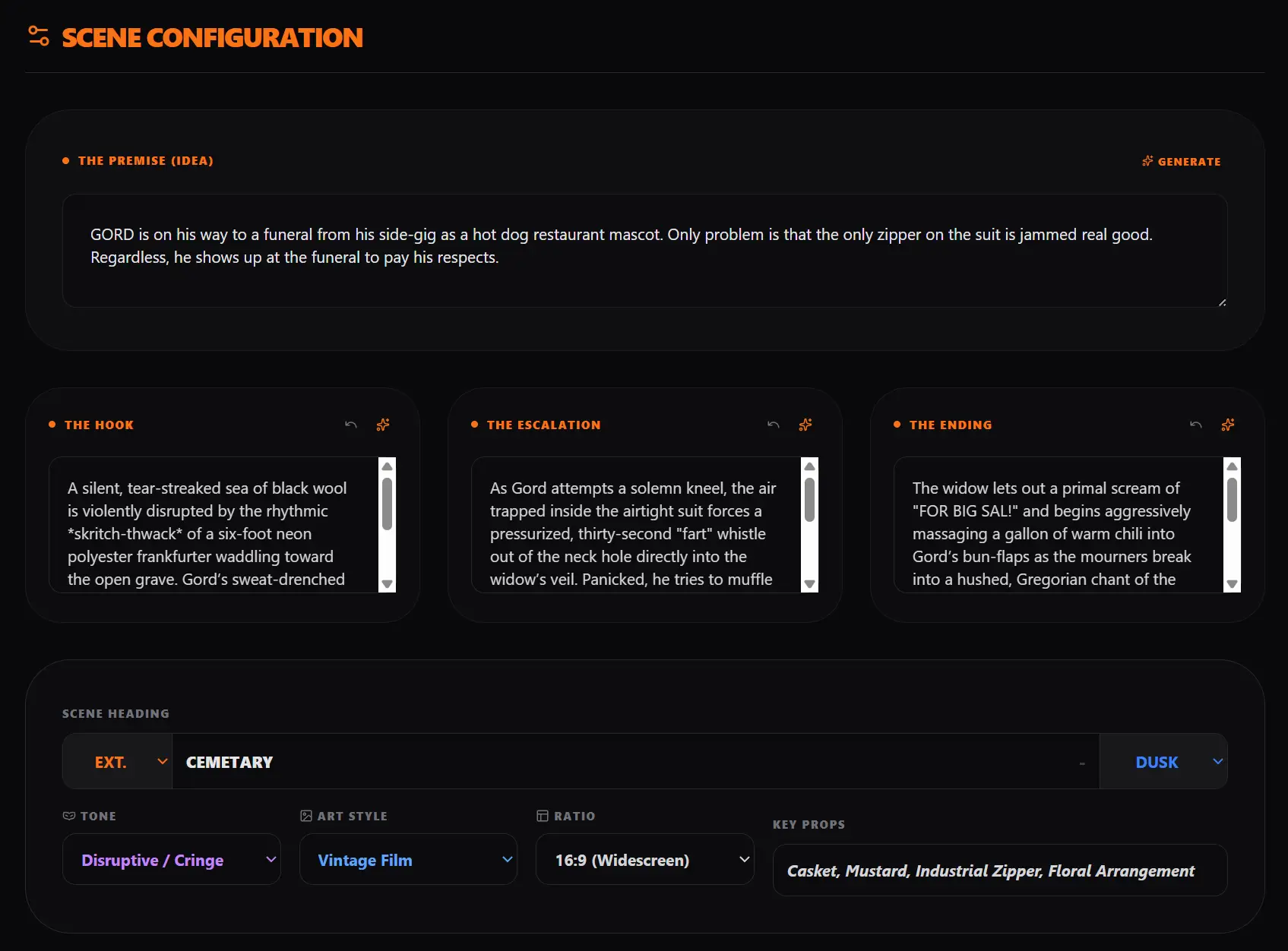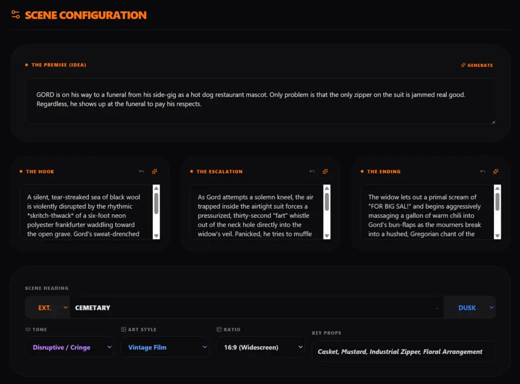 The Look & Tone: Select your aspect ratio, your visual style, and your comedic tone (Absurdist, Disruptive/Cringe, Deadpan, Slapstick). If it’s a mockumentary, the rig needs to know it’s a mockumentary.