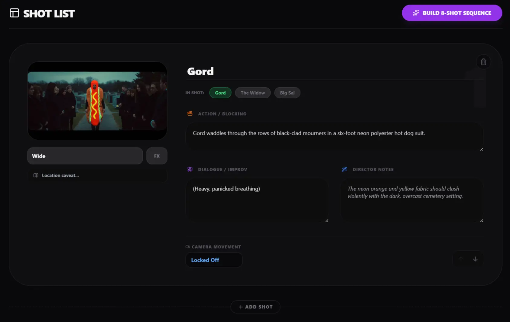 Call the Camera Move: A locked-off wide shot of a funeral is fine context, but a sudden crash zoom into a panicked face is a punchline. Call your whips, creeps, and tracking shots.