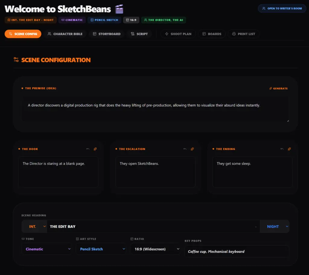 SketchBeans isn’t a bloated enterprise word processor. It’s a digital production clipboard built specifically for digital creators and filmmakers. It strips away the friction and focuses entirely on the things that actually make it to the screen: blocking the action, calling the camera moves, and generating a shoot plan so you don’t waste time on set.